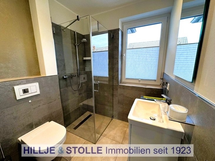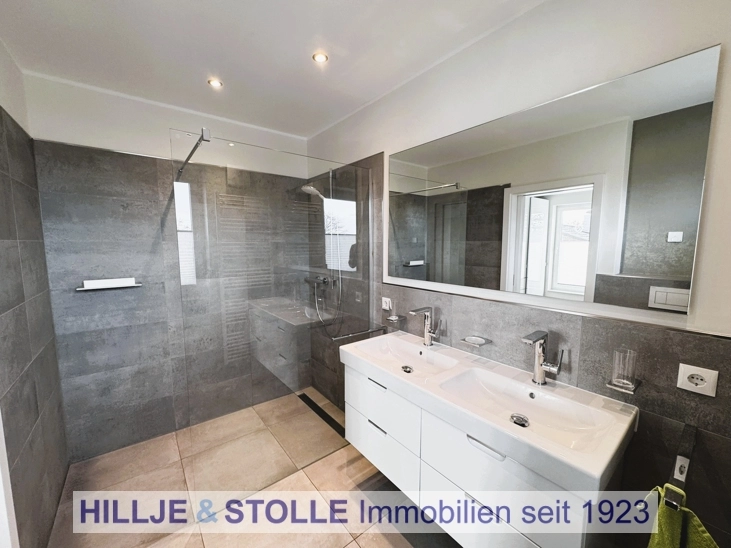 Zwei elegant gestaltete Designbäder, jeweils mit modernen, ebenerdigen Duschen, bieten höchsten Komfort und Exklusivität.