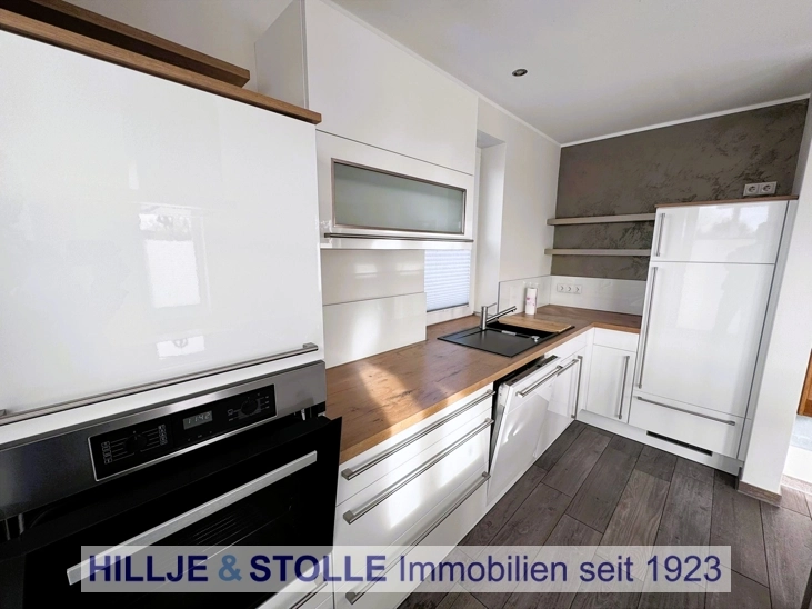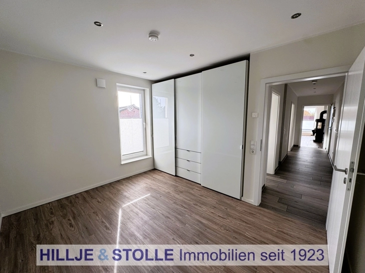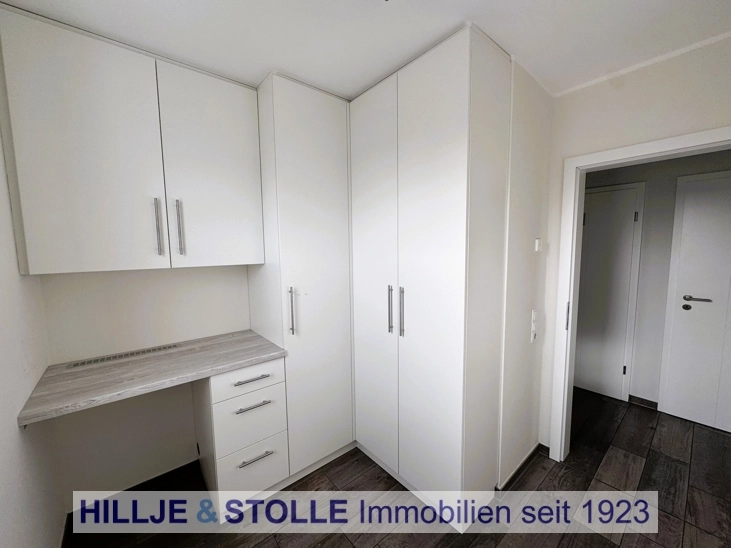 Ein besonderer Blickfang ist der Fußbodenbelag in stilvoller Designoptik, der in allen Räumen eine harmonische Atmosphäre schafft. Praktische Einbauschränke bieten reichlich Stauraum und runden die hochwertig ausgestattete Immobilie ab.
